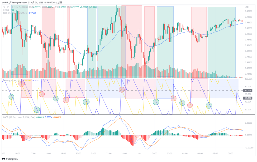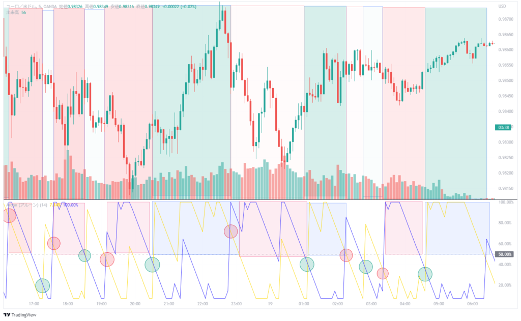 ・Aroon Upが50を下回ると上昇トレンドが弱まっていて、Aroon Downが50を下回ると下降トレンドが弱まっています。